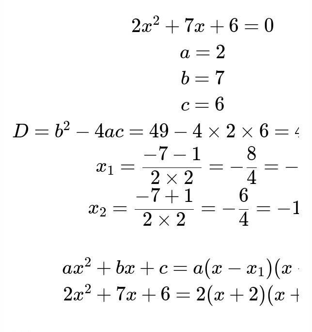 Розкладіть на множники тричлен 2x² + 7x + 6. Його дискримінант дорівнює: . Перший корінь Другий корінь = ... ... = Розклад на множники такий: 2x2 + 7x + 6 =
