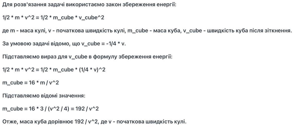 де m - маса кулі, v - початкова швидкість кулі, m_cube - маса куба, v_cube - швидкість куба після зіткнення.