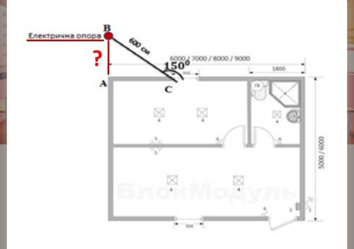 Перед тобою план-карта модульного містечка. В цьому містечку буде встановлено електричні опоридля освітлення ділянки. З'ясуй за малюнком, на якій відстані (у метрах) від будинку буде розташована опора.