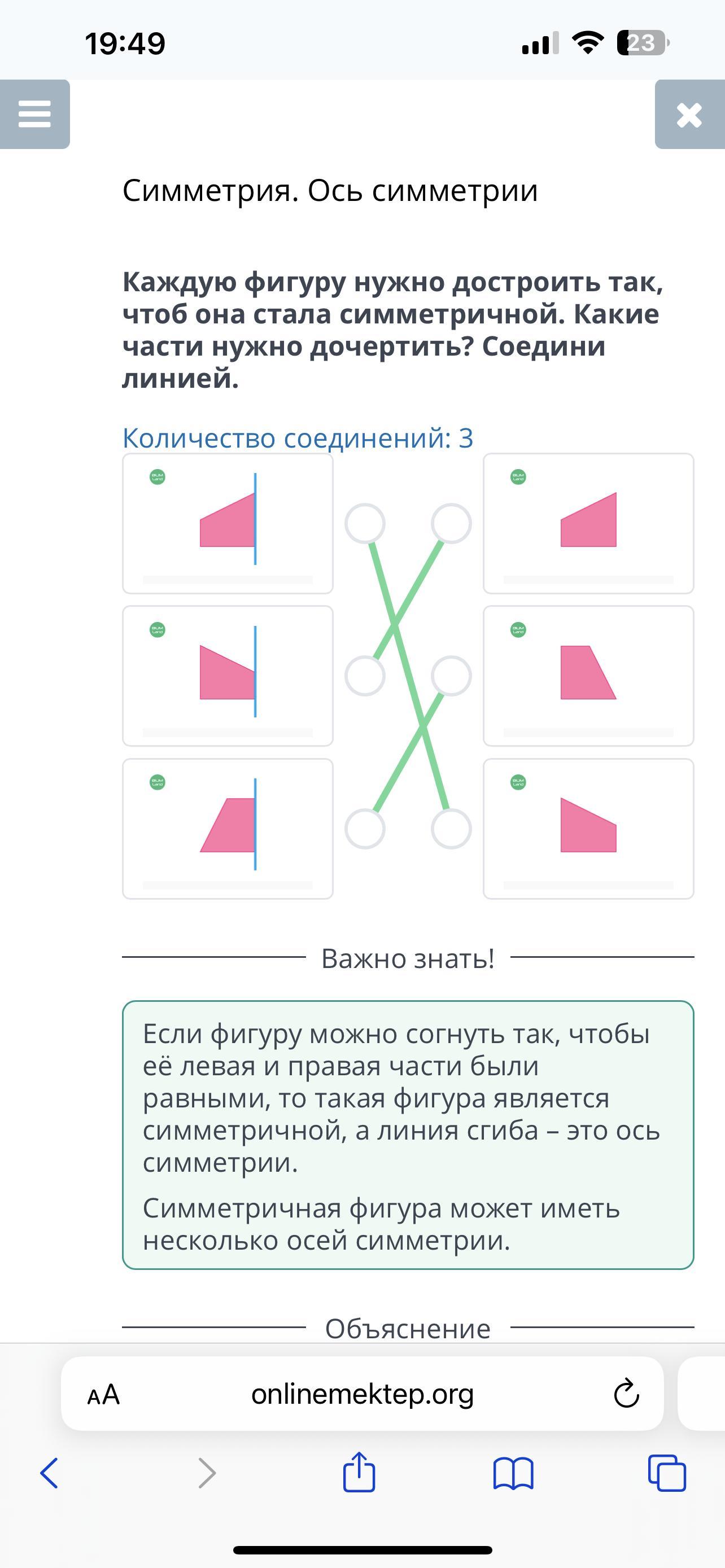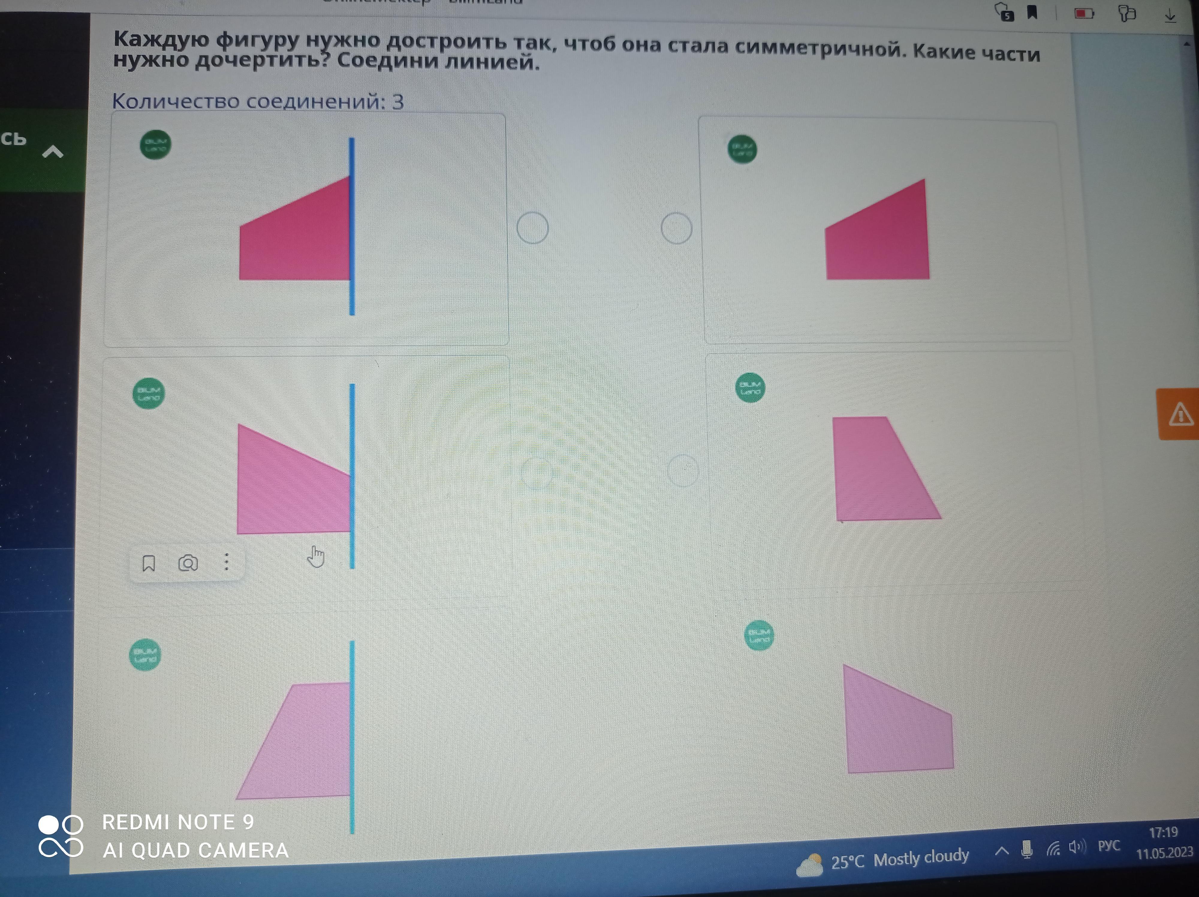 Каждую фигуру нужно достроить так чтобы она стала симметричной какие части нужно дочертить? соедини линией.