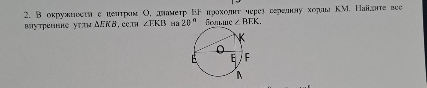 2. В окружности с центром О, диаметр EF внутренние углы ДЕКВ, если ZEKB на 20 ° S проходит через середину хорды КМ. Найдите все больше 2 ВЕК. K B/F Л