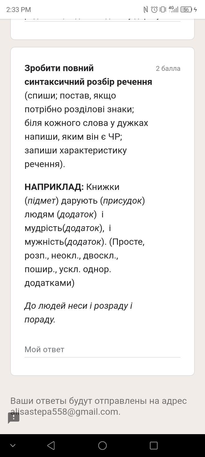 До (прийменник) людей (доповнення) неси (присудок) і (сполучник) розраду (додаток) і (сполучник) пораду (додаток). (Просте, розподілений, неокличний, двоскладний, поширений, однорідний додатками)