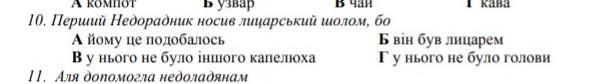 10. Перший Недорадник носив лицарський шолом, бо А йому це подобалось В у нього не було іншого капелюха 11. Аля допомогла недоладянам Б він був лицарем Г у нього не було голови