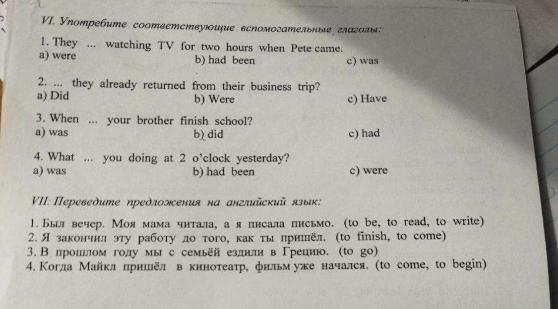 Vii. Translate the sentences into English: 1. it was evening. my mom was reading, and I was writing a letter. (to be, to read, to write) 2. I finished this work before you came. finish, to come) 3. last year my family and I went to greece. go) 4. When Michael came to the cinema, the movie had already started. (to come, to begin)