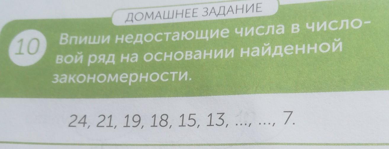 10 ДОМАШНЕЕ ЗАДАНИЕ Впиши недостающие числа в число- вой ряд на основании найденной закономерности. 24, 21, 19, 18, 15, 13, ..., ..., 7.