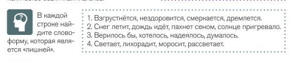 100 бал)) срочнооо В каждой строке най- дите слово- форму, которая явля- ется лишней». 1. Взгрустнётся, нездоровится, смеркается, дремлется. 2. Снег летит, дождь идёт, пахнет сеном, солнце пригревало. 3. Верилось бы, хотелось, надеялось, думалось. 4. Светает, лихорадит, моросит, рассветает.