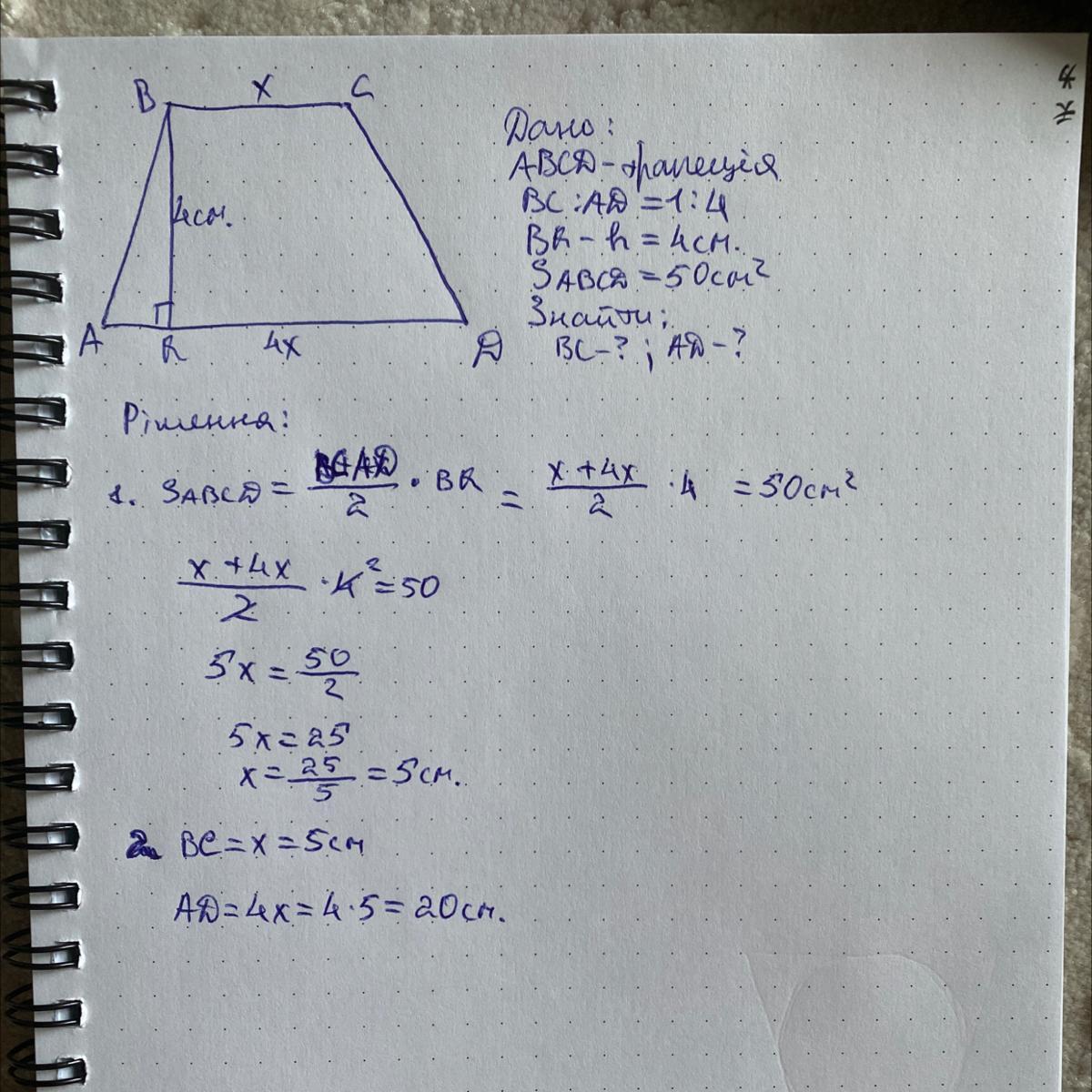 Основи трапеції відносяться як 1 : 4. Знайдіть ці осно- ви, якщо висота трапеції дорівнює 4 см, а площа трапеції 50см²