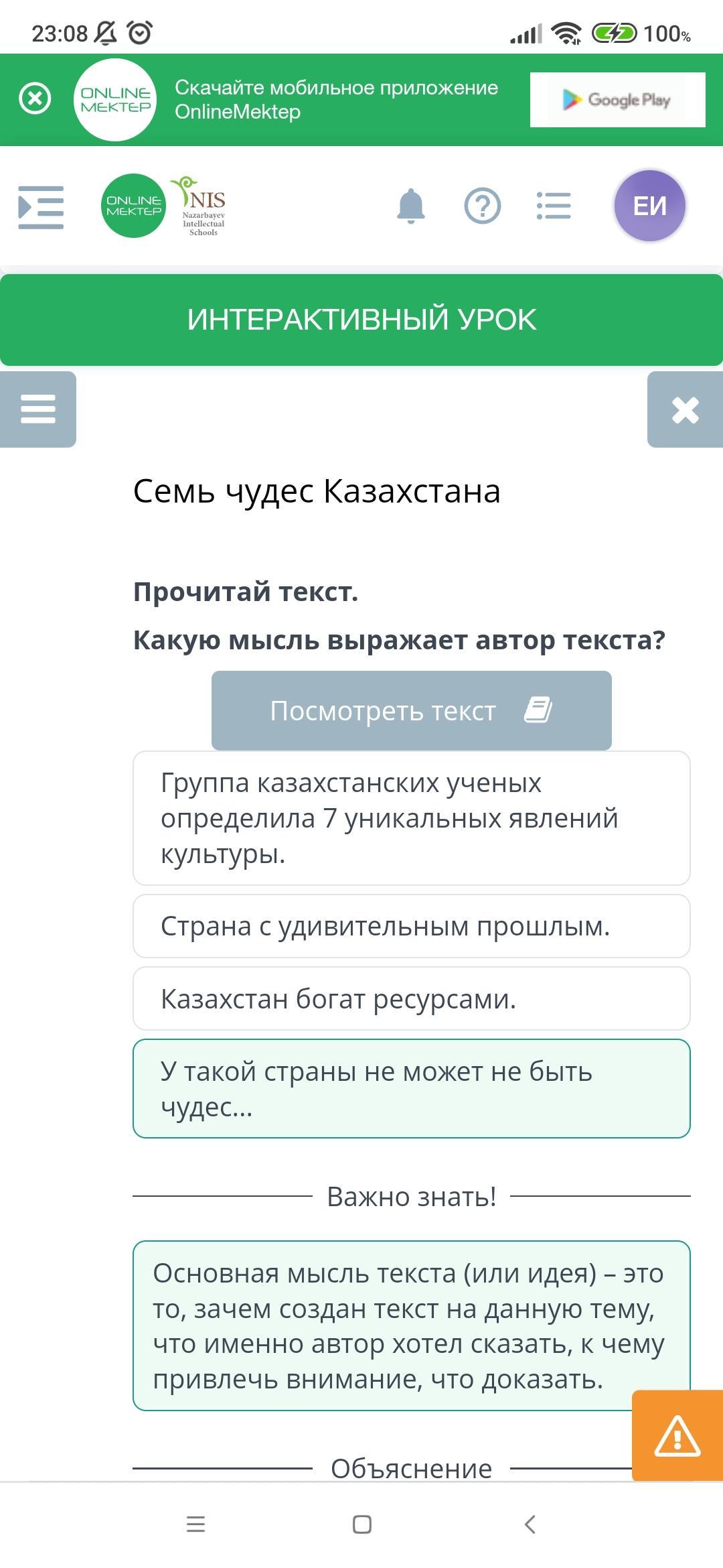 Семь чудес Казахстана Прочитай текст. Какую мысль выражает автор текста? Посмотреть текст Страна с удивительным прошлым. У такой страны не может не быть чудес... Группа казахстанских ученых определила 7 уникальных явлений культуры. Казахстан богат ресурсами.