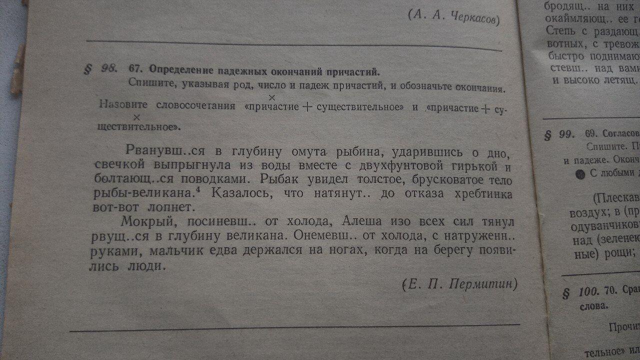 Мокрый, посиневший(ед.ч.,м.р., Им.п.)от холода, Алеша изо всех сил тянул рвущийся(ед.ч., м.р., Р.п.) в глубину великана. Онемевший(ед.ч.,мр.р.,Им.п.) от холода, с натруженными(ед.ч.,ж.р., Т.п.) руками, мальчик едва держался на ногах, когда на берегу появились люди.