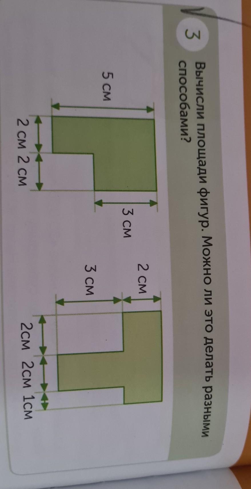3 Вычисли площади фигур. Можно ли это делать разными способами? 5 см 2 cm 2 см 3 см 2 CM T 2см 2см 1см 3 см