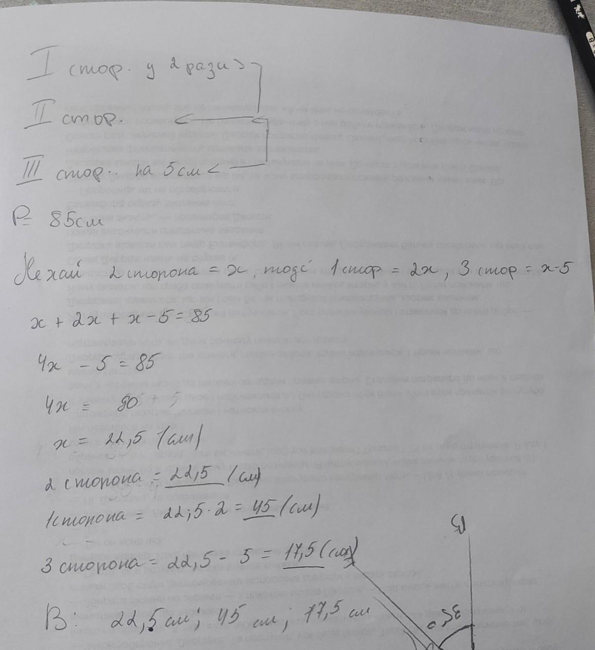 1 сторона = 22,5(см) , 2 сторона = 45 (см), 3 сторона = 17,5 (см)