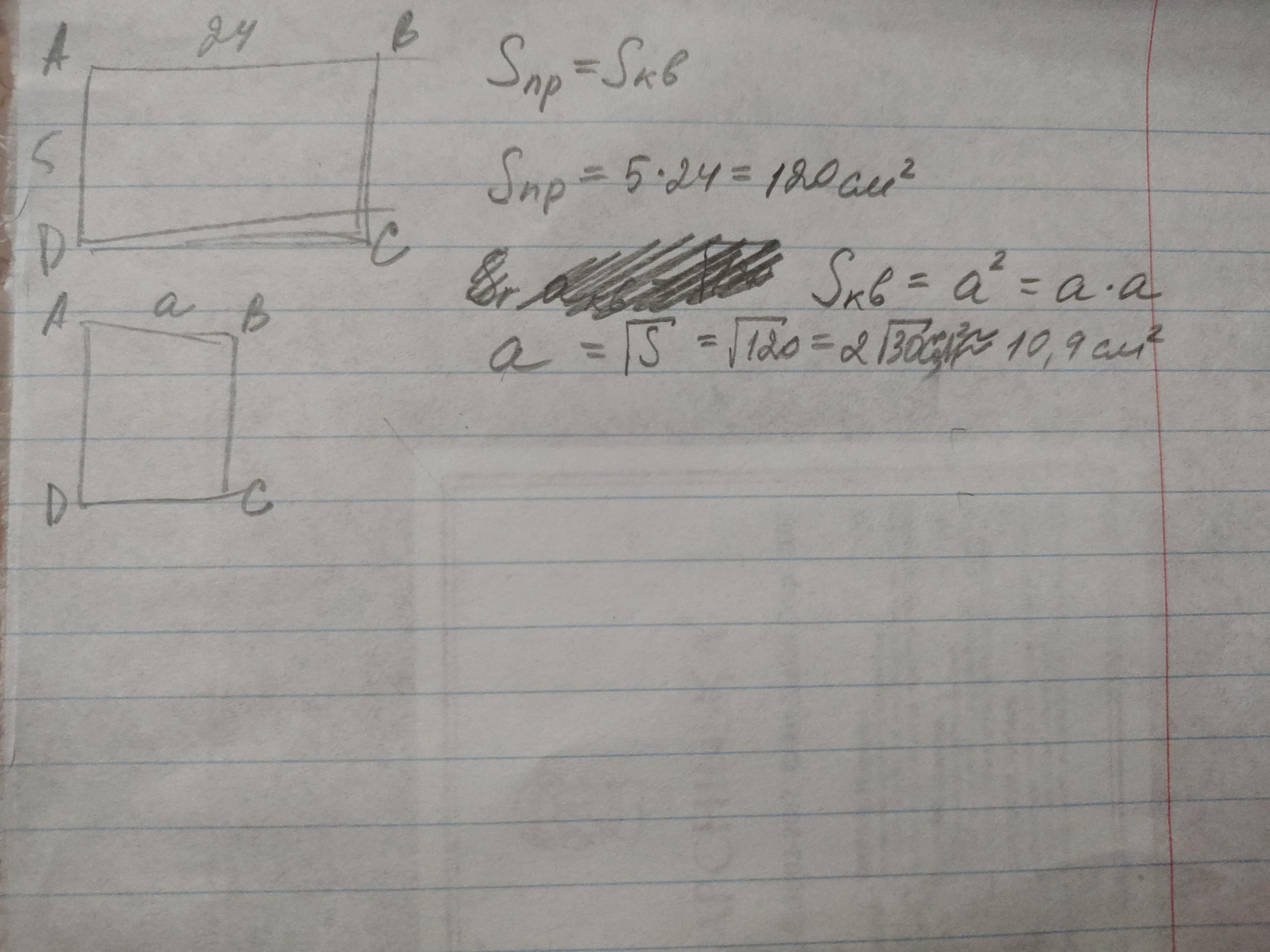 Прямокутник зі сторонами 5 см і 24 см має таку саму площу, як і периметр квадрата. Знайдіть сторону квадрата