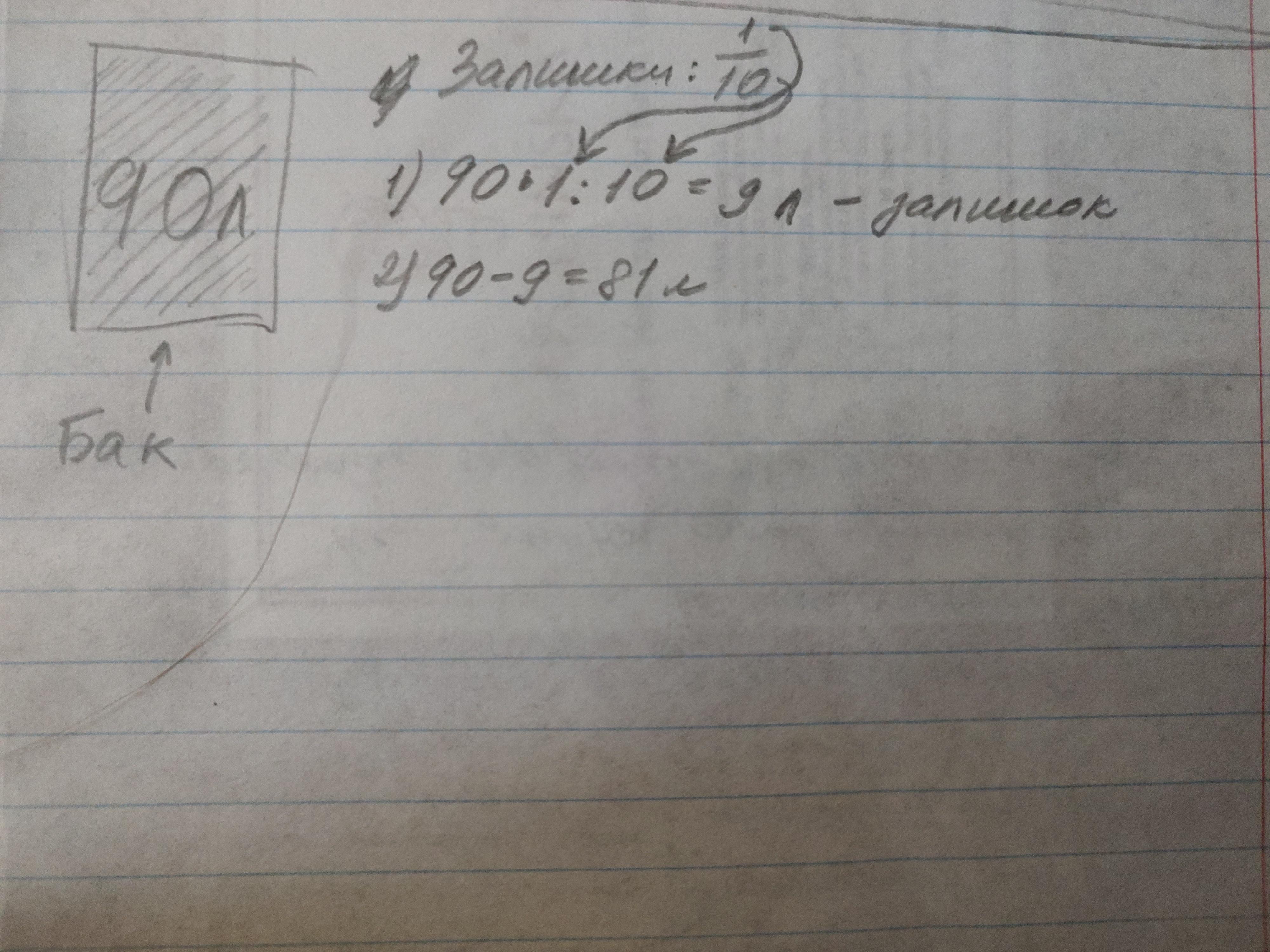 Бак трактора вміщує 90 л пального. Після по- льових робіт у баку залишилася десята части- на пального. Скільки літрів пального було ви- трачено?