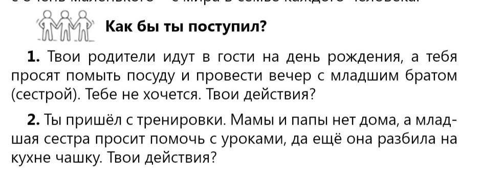 Как бы ты поступил? 1. Твои родители идут в гости на день рождения, а тебя просят помыть посуду и провести вечер с младшим братом (сестрой). Тебе не хочется. Твои действия? 2. Ты пришёл с тренировки. Мамы и папы нет дома, а млад- шая сестра просит помочь с уроками, да ещё она разбила на кухне чашку. Твои действия?