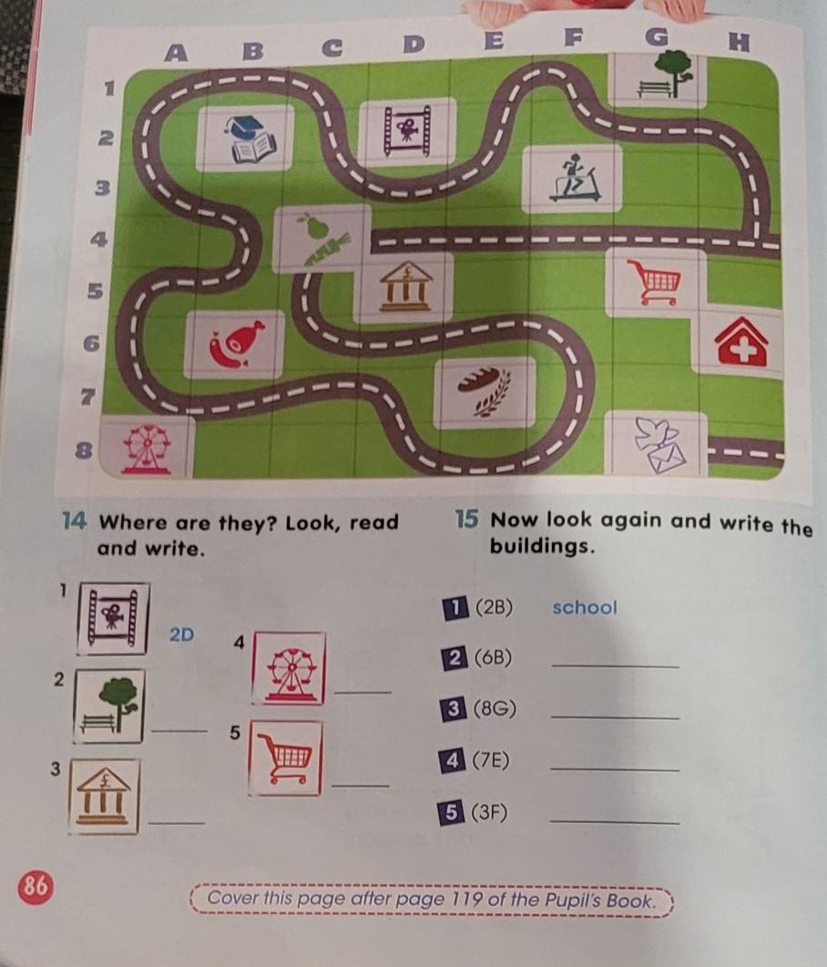 15 Now look again and write the buildings. 1 (2B) 2 (6B) 3 (8G) 4 (7E) 5 (3F) school.