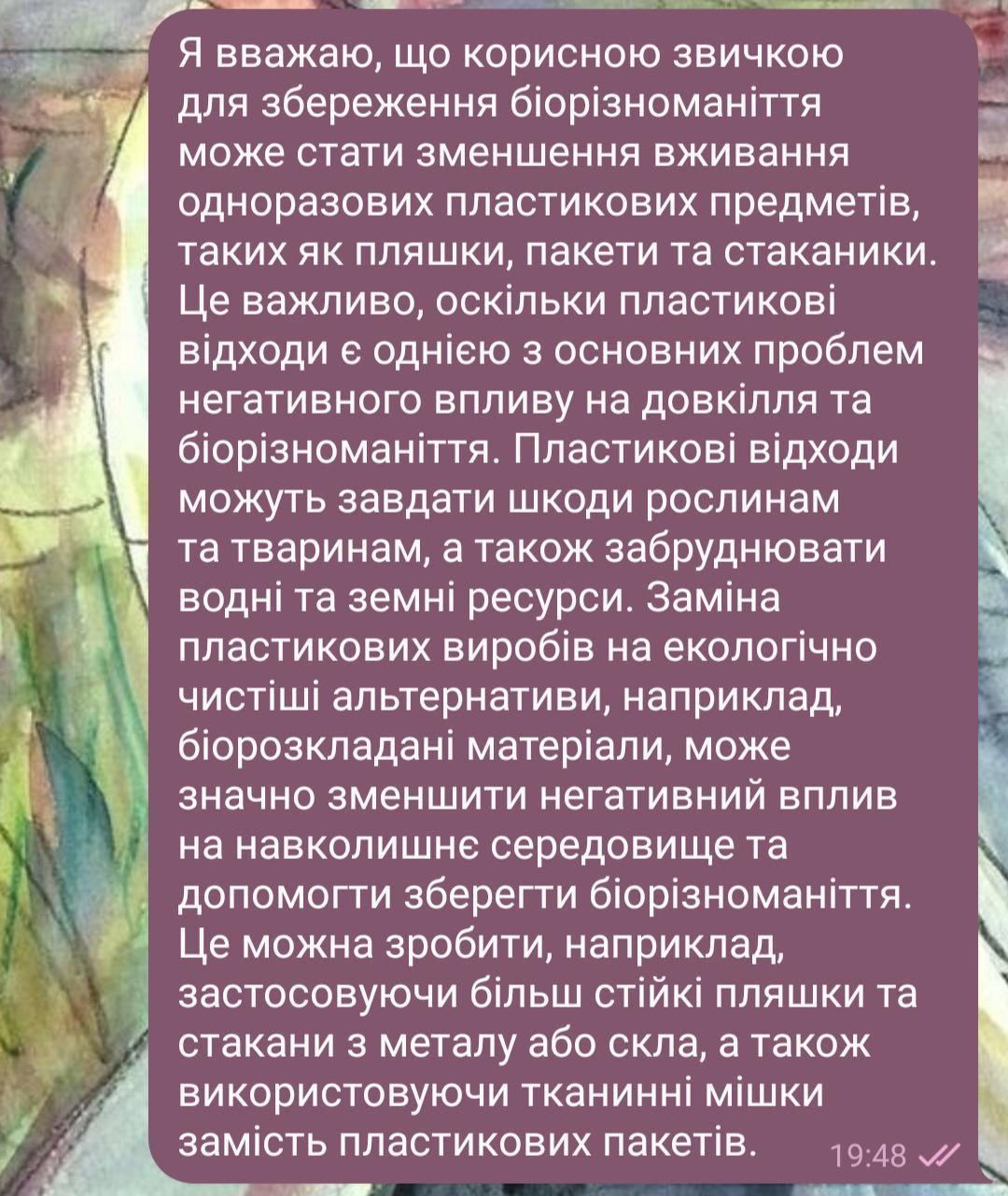 Я вважаю, що корисною звичкою для збереження біорізноманіття може стати зменшення вживання одноразових пластикових предметів, таких як пляшки, пакети та стаканики. Це важливо, оскільки пластикові відходи є однією з основних проблем негативного впливу на довкілля та біорізноманіття. Це можна зробити, наприклад, застосовуючи більш стійкі пляшки та стакани з металу або скла, а також використовуючи тканинні мішки замість пластикових пакетів.