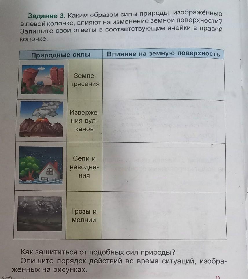 Задание 3. Каким образом силы природы, изображённые в левой колонке, влияют на изменение земной поверхности? Запишите свои ответы в соответствующие ячейки в правой колонке.