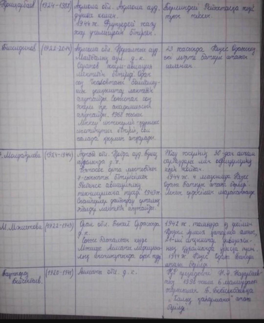 ЖАЗЫЛЫМ -тапсырма. 4 Мәтінді және қосымша мәліметтерді пайдаланып, берiлген кестені толтыр. Аты-жөні Рақымжан Қошқарбаев Талғат Бигелдинов Әлия Молдағұлова Мәншүк Мәметова Бактыораз Бейсекбаев Өмiр жылдары Туған жері, оқыған оку орны Ерліктері
