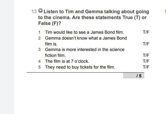13 Listen to Tim and Gemma talking about going to the cinema. Are these statements True (T) or False (F)? 1 2 Tim would like to see a James Bond film. Gemma doesn't know what a James Bond film is. 3 Gemma is more interested in the science fiction film. 4 The film is at 7 o'clock. 5 They need to buy tickets for the film. T/F T/F T/F T/F T/F