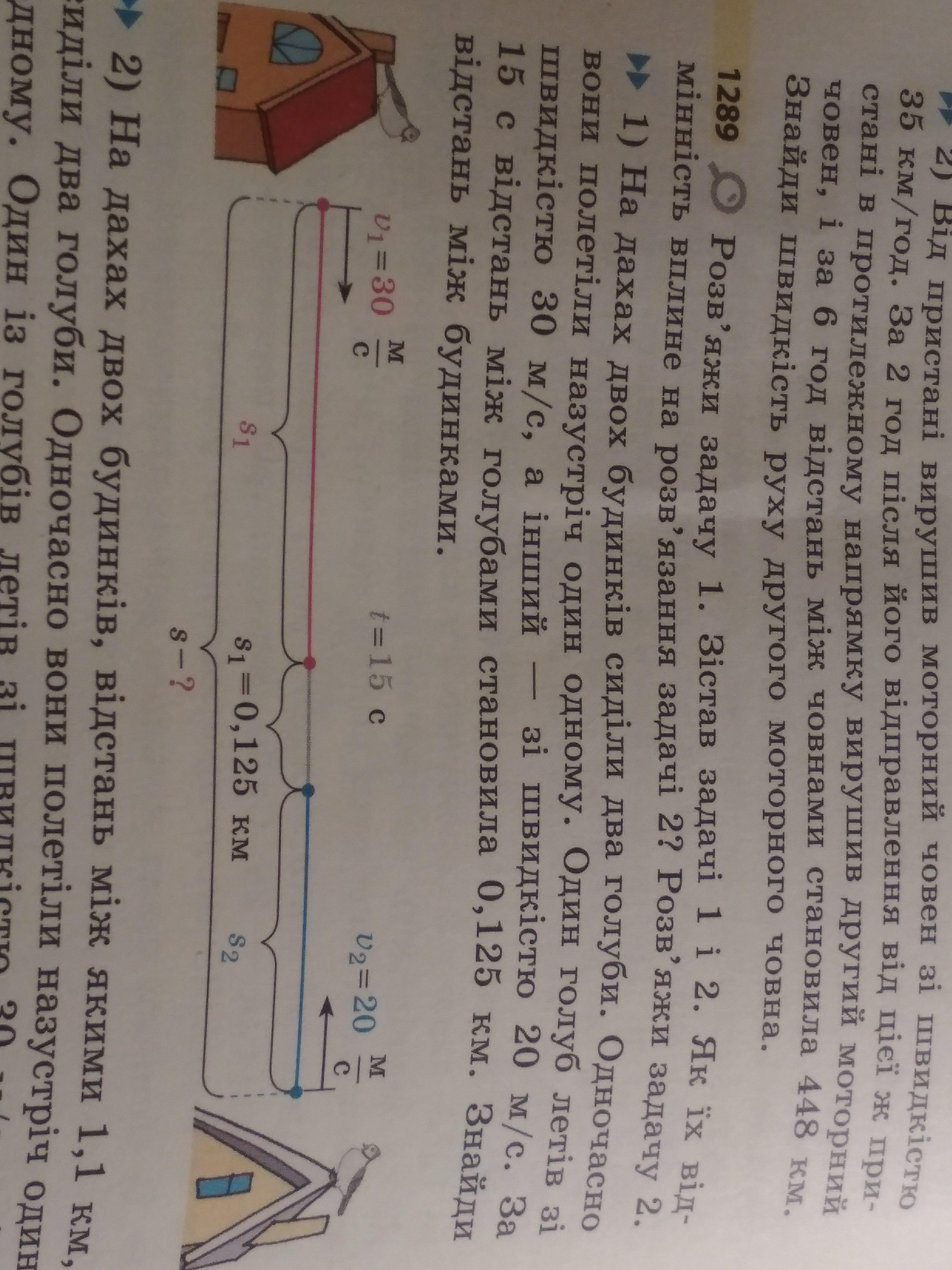Після 15-секундного польоту відстань між голубами становить 0.125 км. Отже, відстань між будинками становить 0.75 + 0.125 = 0.875 км