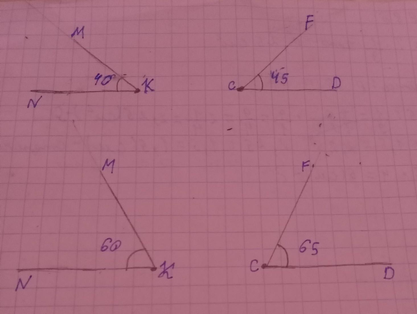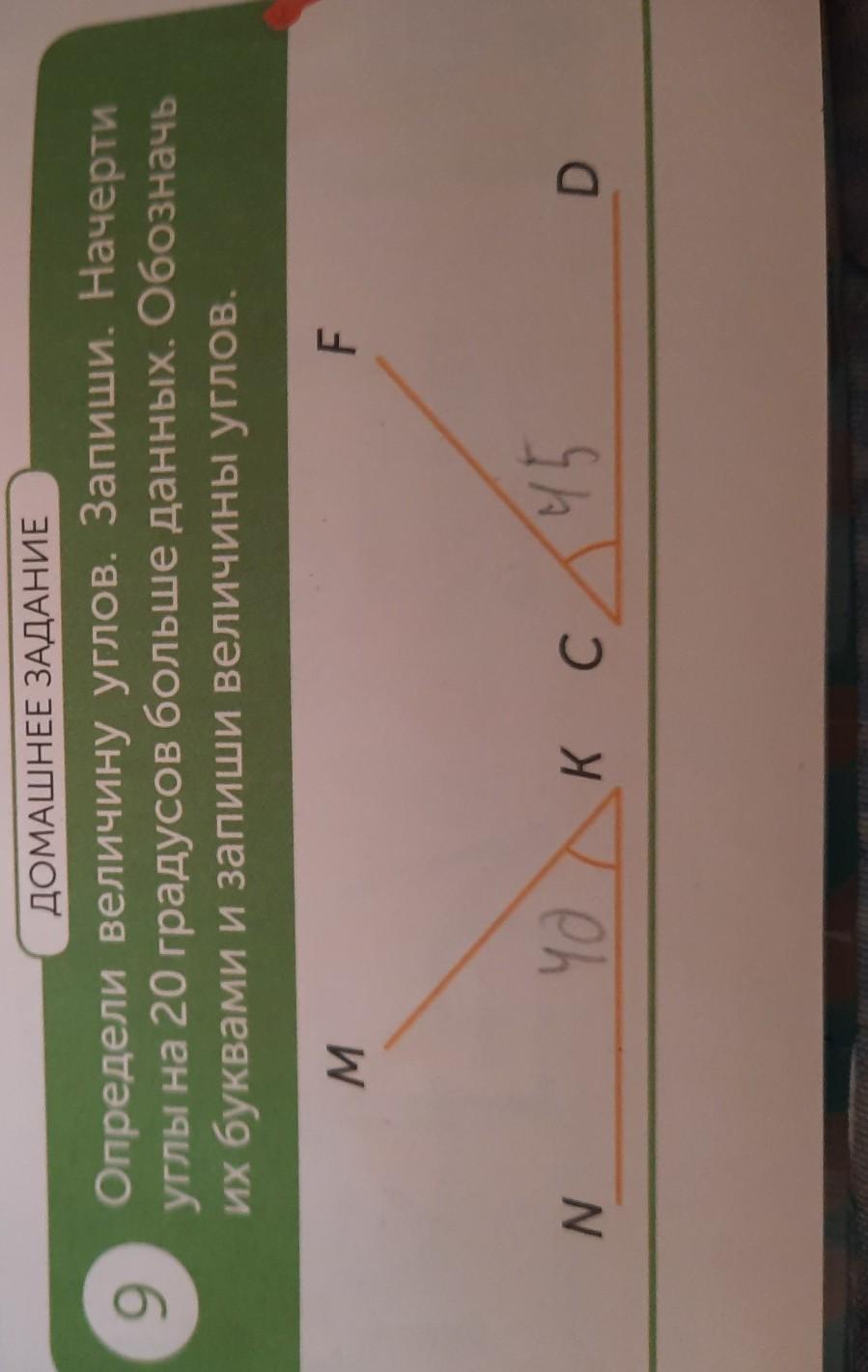 9 ДОМАШНЕЕ ЗАДАНИЕ Определи величину углов. Запиши. Начерти углы на 20 градусов больше данных. Обозначь их буквами и запиши величины углов. M F N с 45 чак с K D СРОЧНО!!!! дам 20 баллов