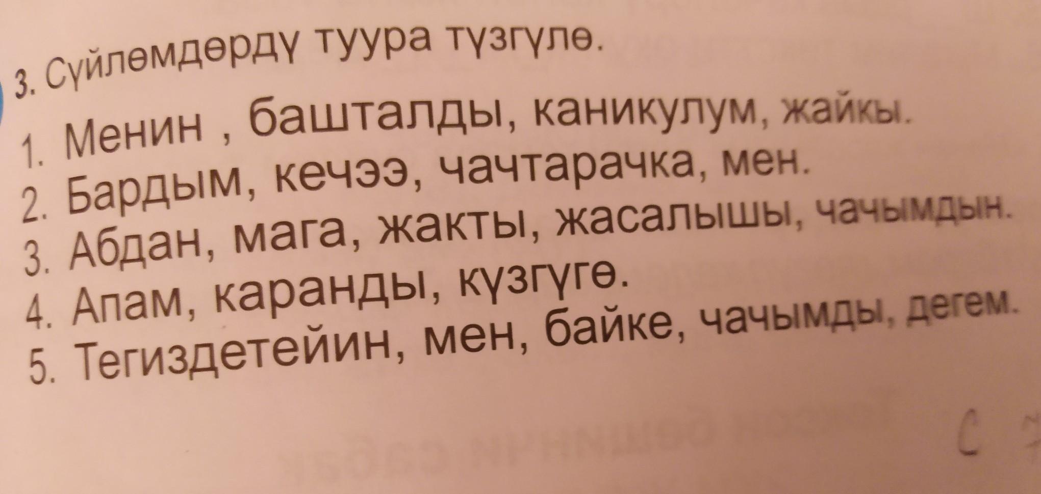 3. Суйлемдөрдү туура түзгүлө. О 1. Менин, башталды, каникулум, жайкы. 2. Бардым, кечээ, чачтарачка, мен. 3. Абдан, мага, жакты, жасалышы, чачымдын. 4. Апам, каранды, күзгүгө. 5. Тегиздетейин, мен, байке, чачымды, дегем.