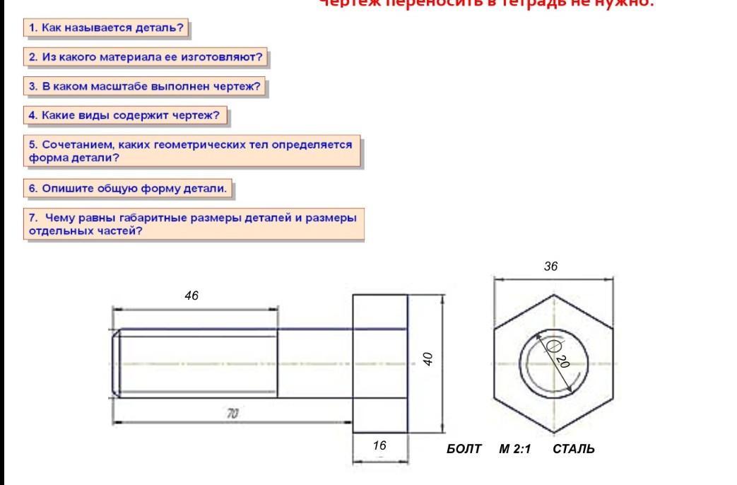 Домашняя работа 1. Как называется деталь? 2. Из какого материала ее изготовляют? 3. В каком масштабе выполнен чертеж? 4. Какие виды содержит чертеж? 5. Сочетанием, каких геометрических тел определяется форма детали? Прочитай чертёж. Запиши описание по вопросам, используя образец. Чертёж переносить в тетрадь не нужно. 6. Опишите общую форму детали. 7. Чему равны габаритные размеры деталей и размеры отдельных частей? 46 70 16 40 36 БОЛТ м 2:1 СТАЛЬ
