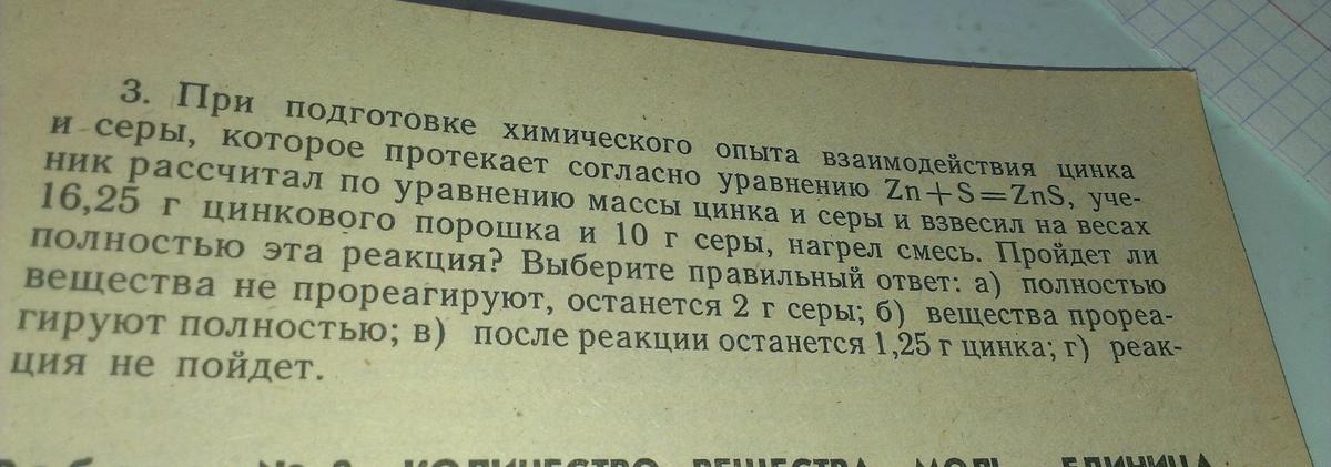 при подготовке химического опыта взаимодействия цинка и серы, которое протекает согласно уравнению Zn+S=ZnS,