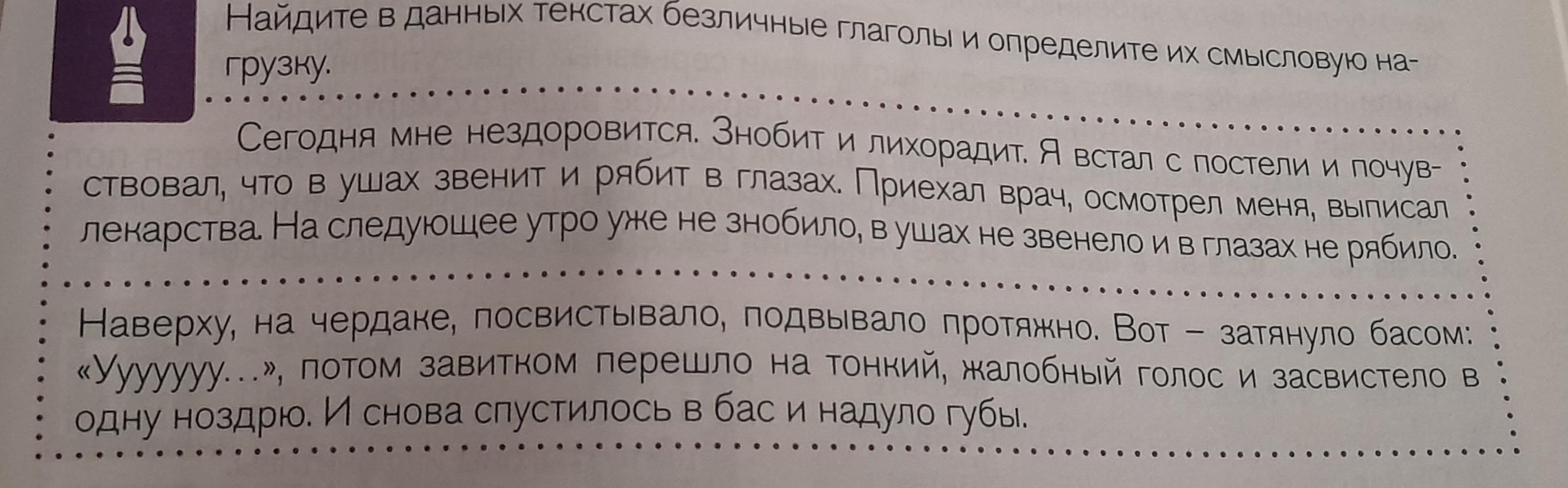 нездоровится, знобит, лихорадит, звенит, не знобило, не звенело, не рябило, посвистывало, подвывало, засвистело.