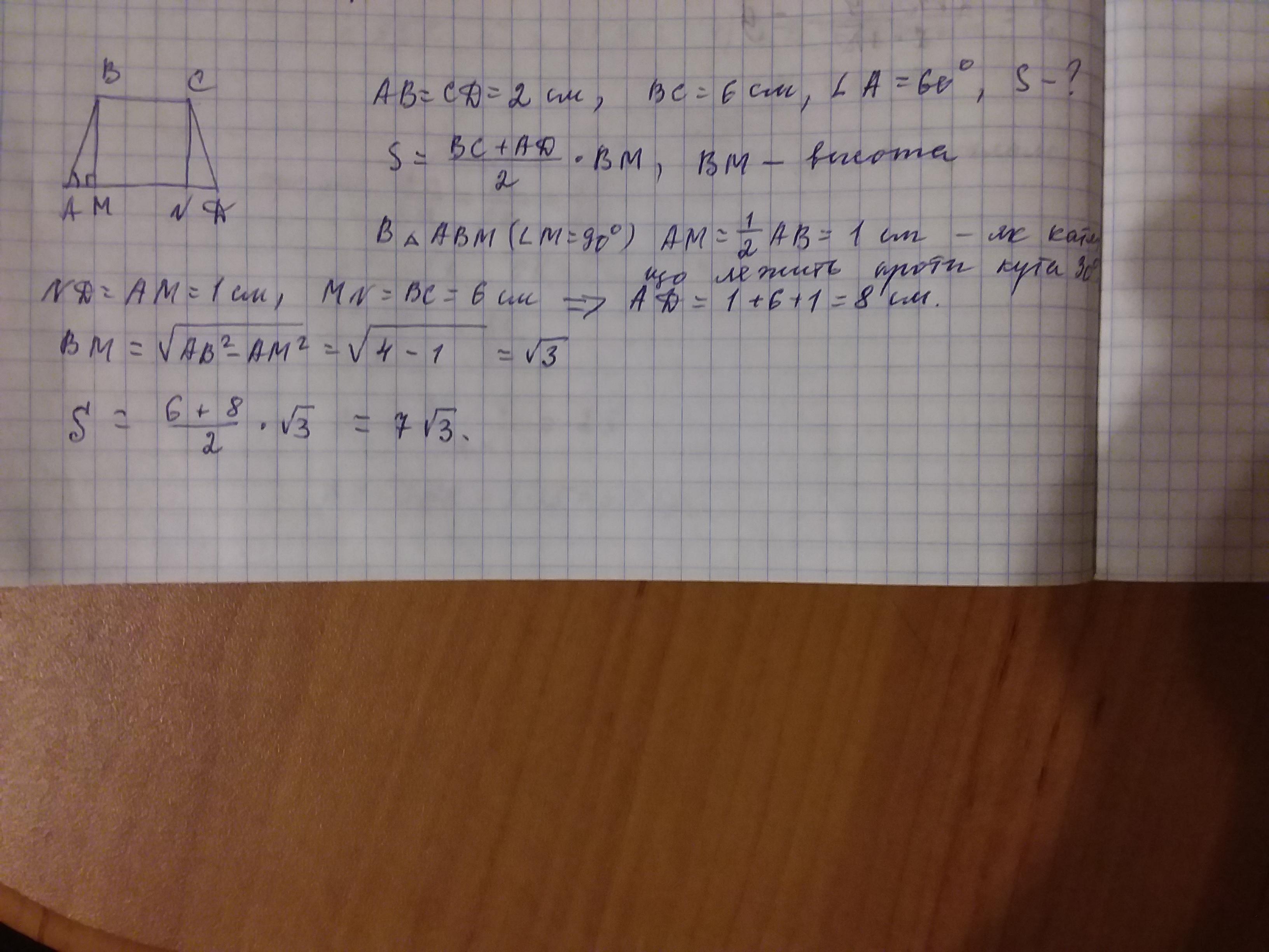 менша основа рівнобічної трапеції дорівнює 6 см а бічна сторона 2 см . знайдіть площу трапеції , якщо її гострий кут дорівнює 60*