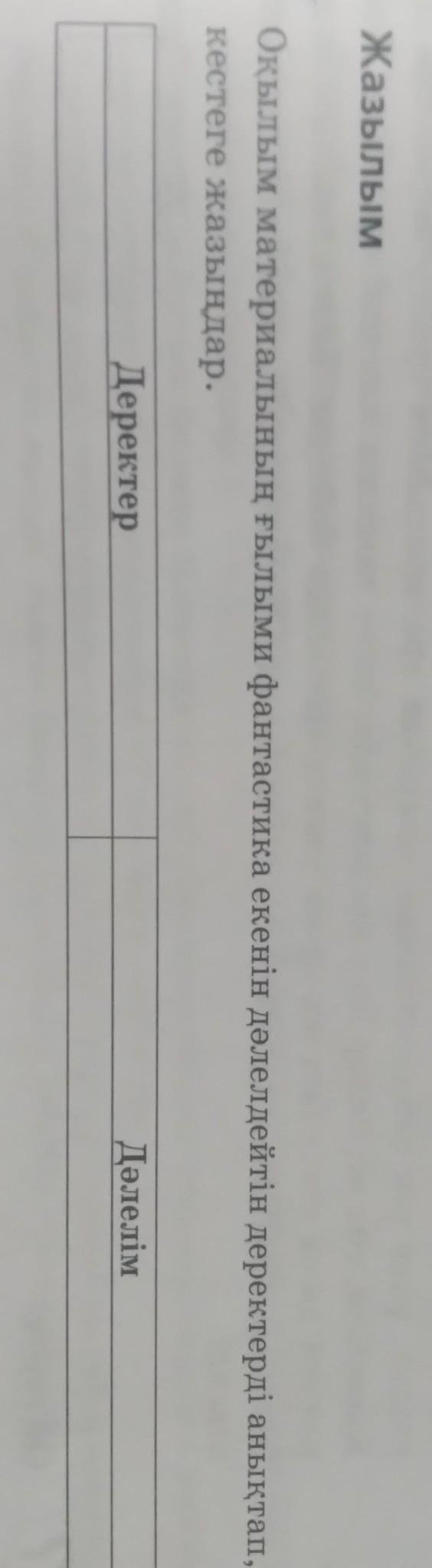 Окылым материалының ғылыми фантастика екенін дәлелдейтiн деректердi аныктап, кестеге жазындар. Деректер Дәлелім