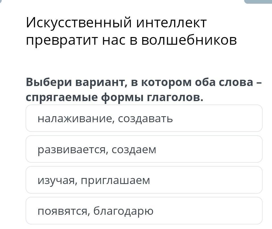 Выбери вариант, в котором оба слова – спрягаемые формы глаголов. налаживание, создавать развивается, создаем изучая, приглашаем появятся, благодарю