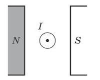 Лінії магнітної індукції виходять з північного полюсу (N) й входять у південний (S). Крапка всередині провідника говорить про те, що струм прямує назустріч нам.