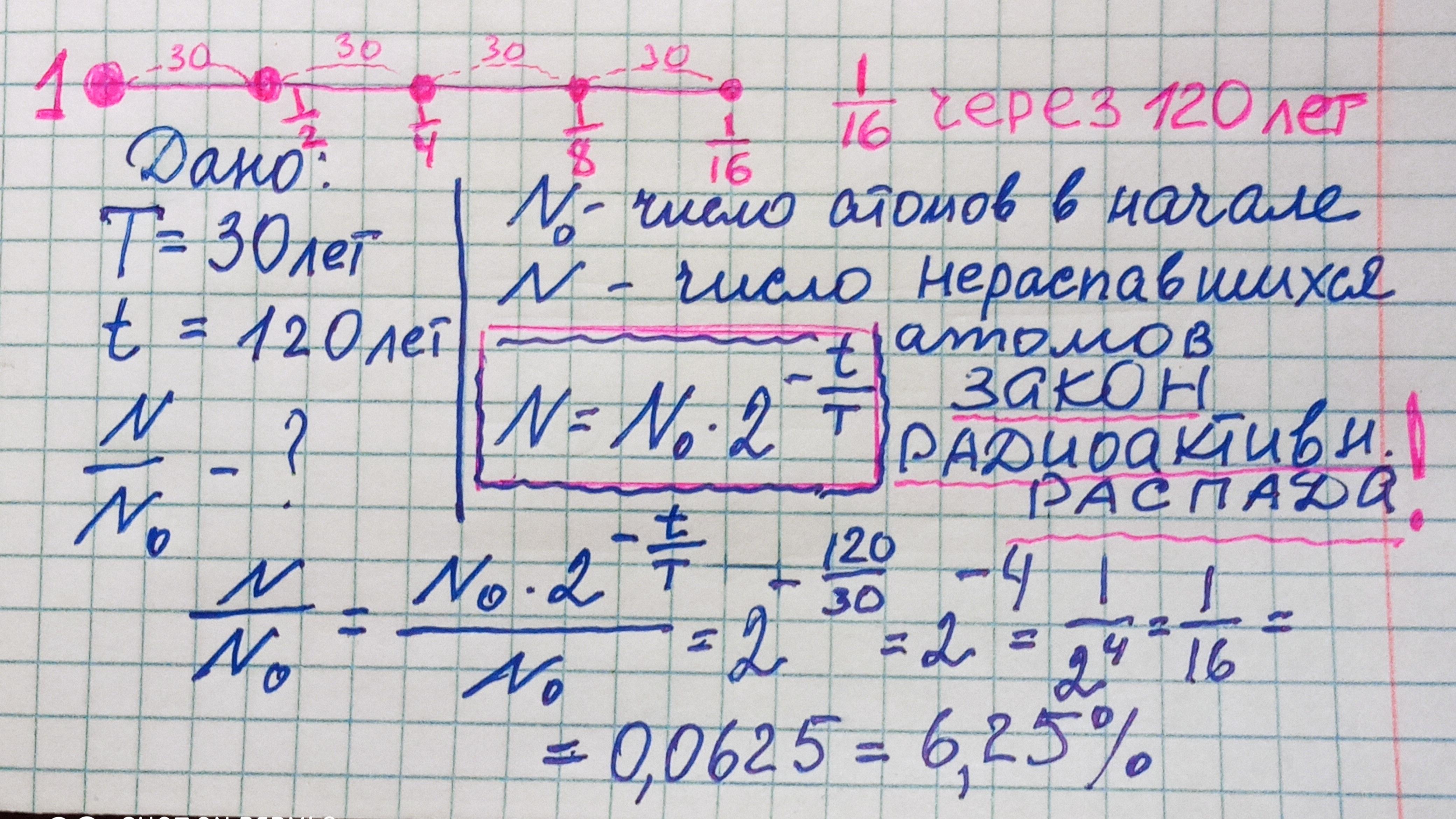 Період піврозпаду цезію -137 становить 30 років. Скільки відсотків ядер цього радіонукліда розпадеться за 120 років? ( 2 бали)