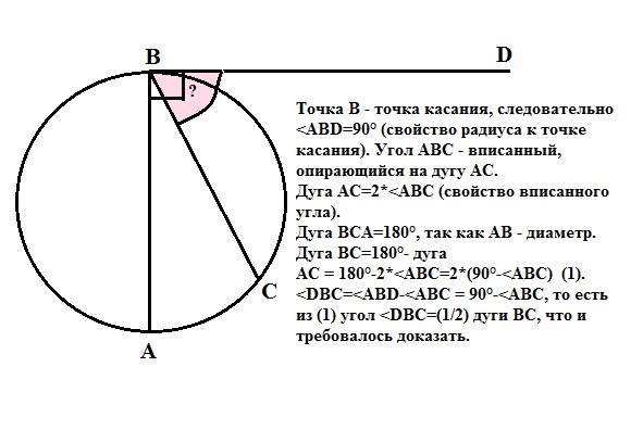 из (1) угол <DBC=(1/2) дуги ВС, что и требовалось доказать.