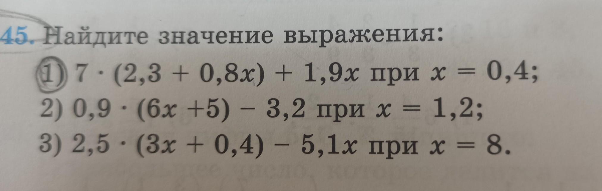Если х = 0.4, то 7 * (2.3 + 0.8 * 0.4) + 1.9 * 0.4 = 19.1