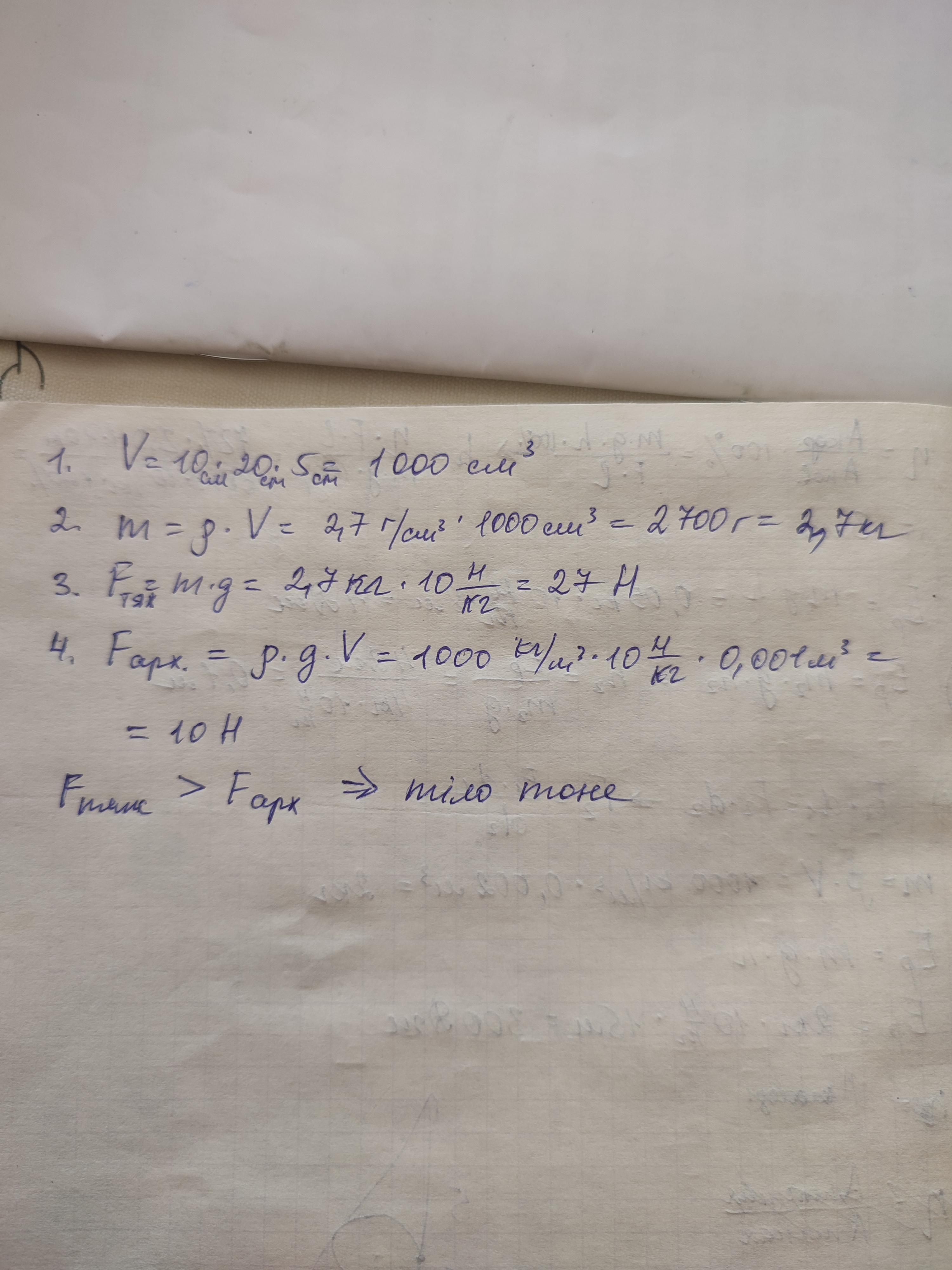 Алюмінієвий брусок розмірами 10х20х5 см занурено у воду. Плаває це тіло у воді чи тоне? ( густина алюмінію 2,7 г/ см3, густина води 1000 кг/ м3 )