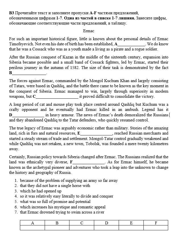 В3 Прочитайте текст и заполните пропуски A-F частями предложений, обозначенными цифрами 1-7. Одна из частей в списке 1-7 лишняя. Занесите цифры, обозначающие соответствующие части предложений, в таблицу.
