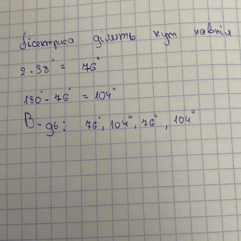 знайдіть кути паралелограма, якщо бісектриса одного з його кутів перетинає сторону під кутом 38°