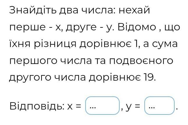 Знайдіть два числа: нехай перше - x, друге - у. Відомо, що їхня різниця дорівнює 1, а сума першого числа та подвоєного другого числа дорівнює 19. Відповідь: x = ... , y = y= ...