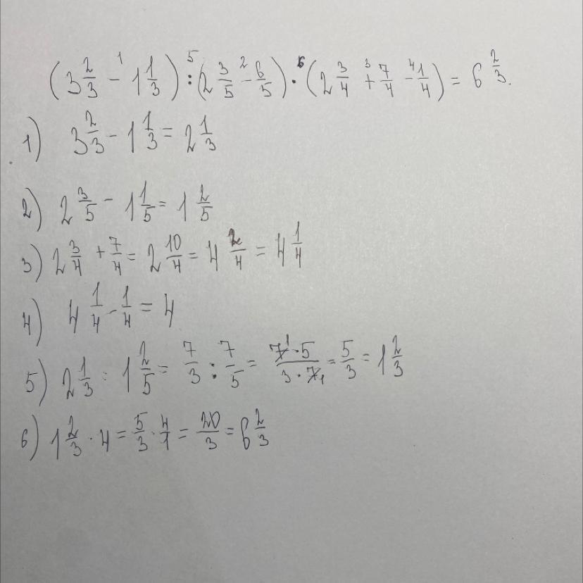 (3 2/3 - 1 1/3) / (2 3/5 - 6/5) * (2 3/4 + 7/4 - 1/4)