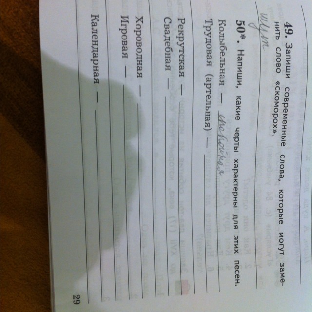 Трудовая-ритмичная,свадебная-нежная,хороводная-зазывчивая громкая,игровая-веселая шумная,колыбельная-тихая ласковая