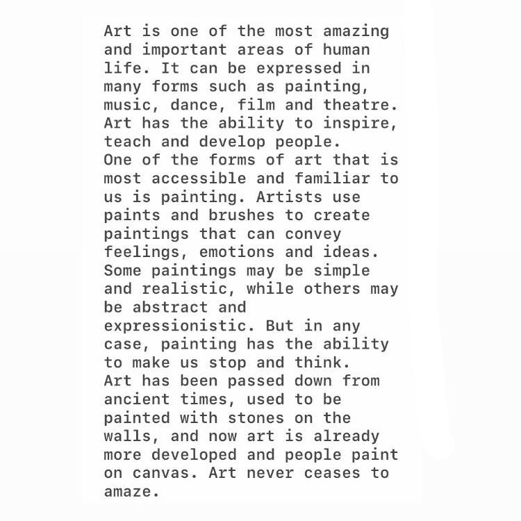 перевод:Искусство является формой творческого выражения, которая охватывает широкий спектр деятельности человека, таких как живопись, скульптура, музыка, танцы и литература. Оно позволяет художникам выразить свои мысли, эмоции и идеи аудитории уникальным и мощным способом. Искусство может быть источником развлечения и вдохновения, а также средством коммуникации и отражения мира вокруг нас