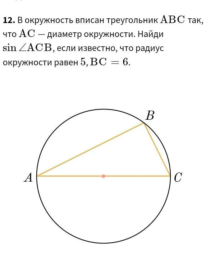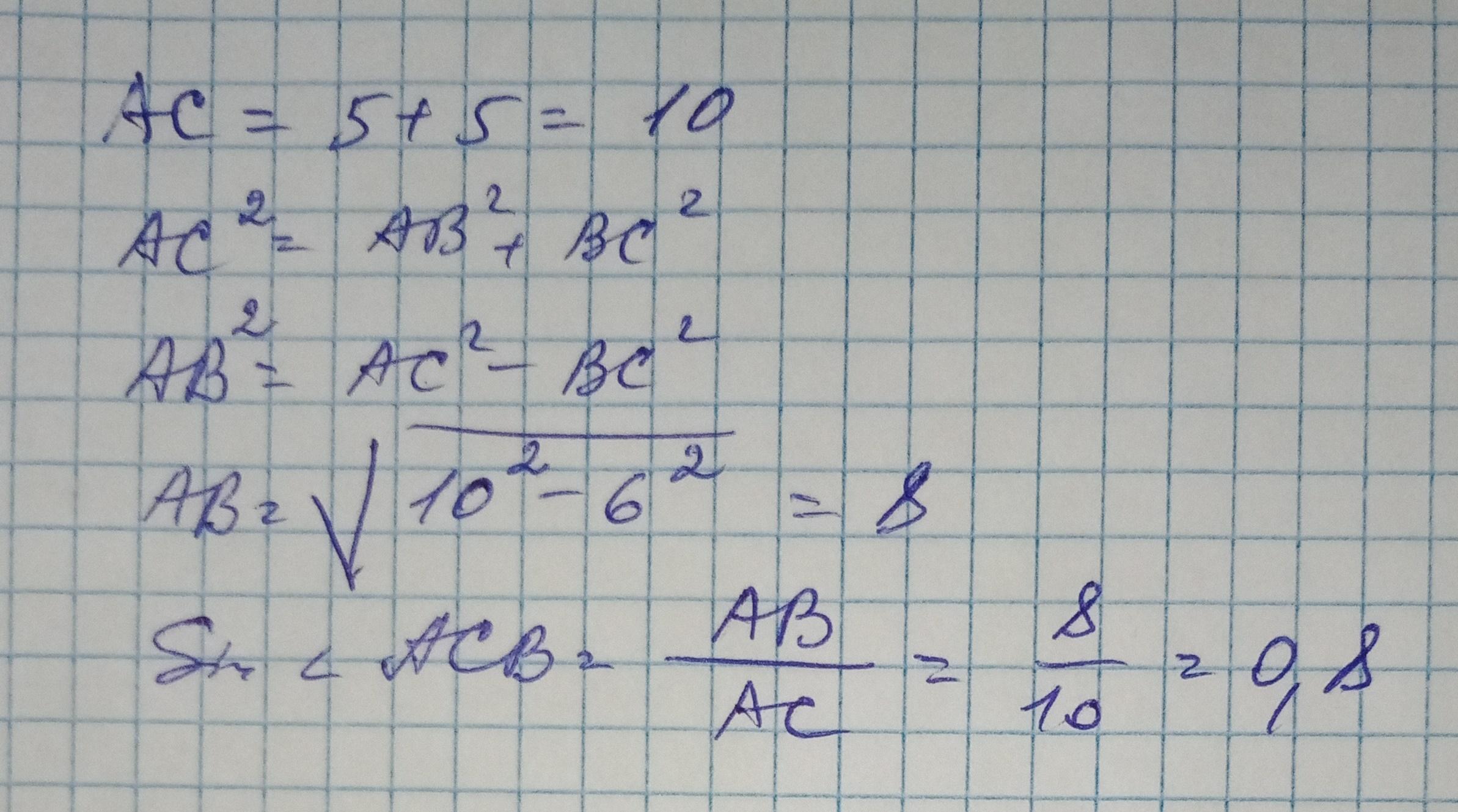 В окружность вписан треугольник ABC так, что AC — диаметр окружности. Найди sin∠ACB, если известно, что радиус окружности равен 5, BC = 6
