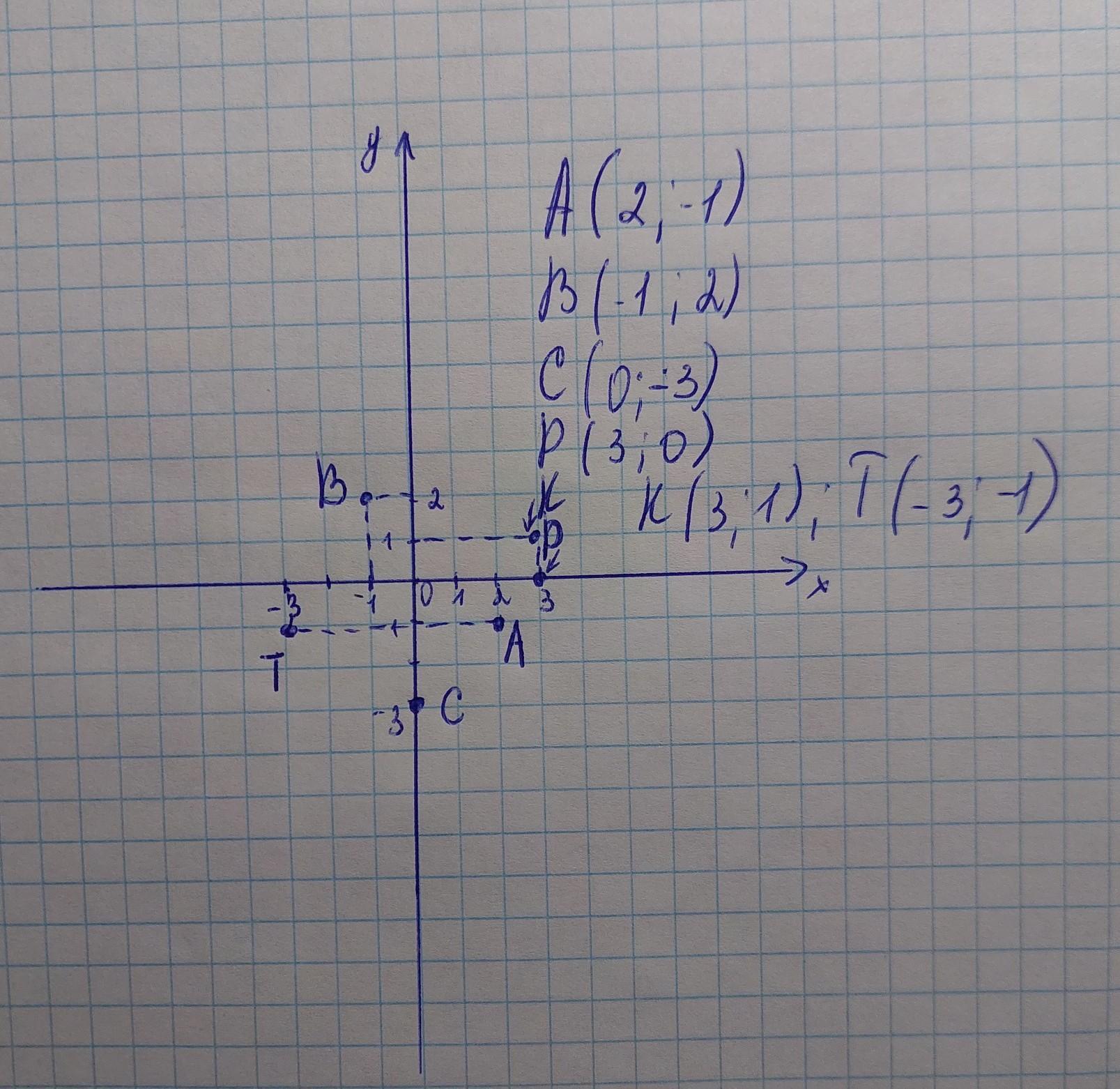 Самостійна робота з математики 6 клас 1 Варіант 1. Побудувати координатну площину та позначити точки: A(2; -1), B(-1; 2), C(0; -3), P(3; 0), K(3; 1), T(-3; -1)
