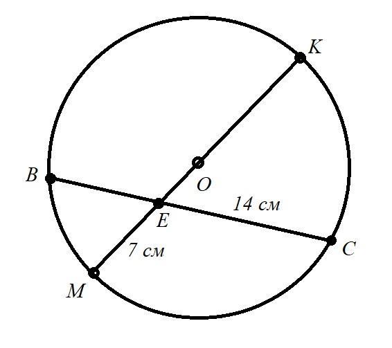 диаметр MK окружности радиуса 11,5 см пересекает хорду BC в точке E. найдите BC, если ME =7 см, CE=14см. прошу с чертежем