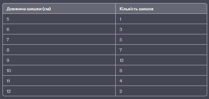 Оскільки шишки ялини звичайної можуть мати різні розміри, ми можемо скласти варіаційний ряд, що містить довжини шишок від найменшої до найбільшої. Потім ми можемо побудувати варіаційну криву, що показує, як часто зустрічаються шишки різних розмірів.