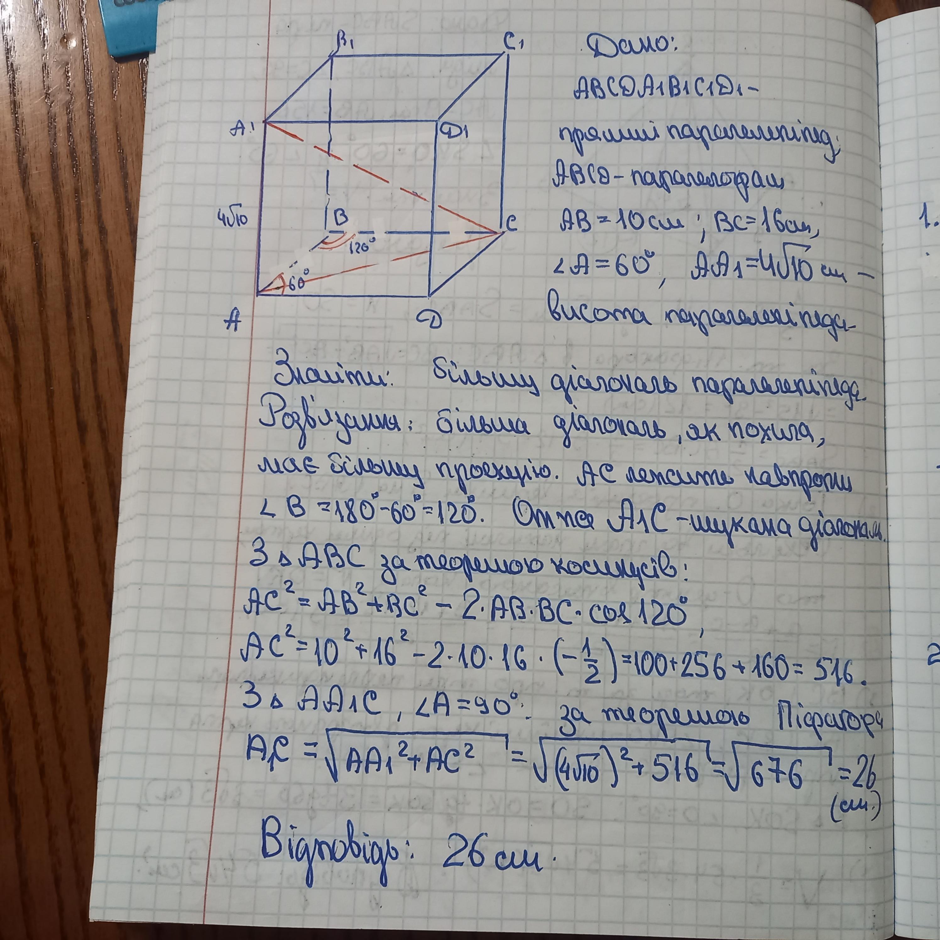 Сторони основи прямого паралелепіпеда дорівнюють 16 см і 10 см, а гострий кут 60°. Знайдіть більшу діагональ паралелепіпеда, якщо його висота -4 корінь 10