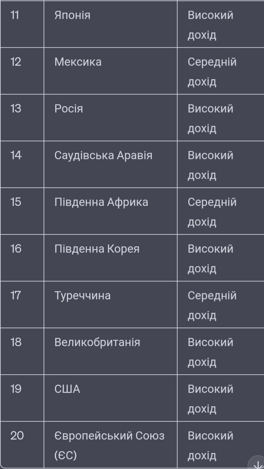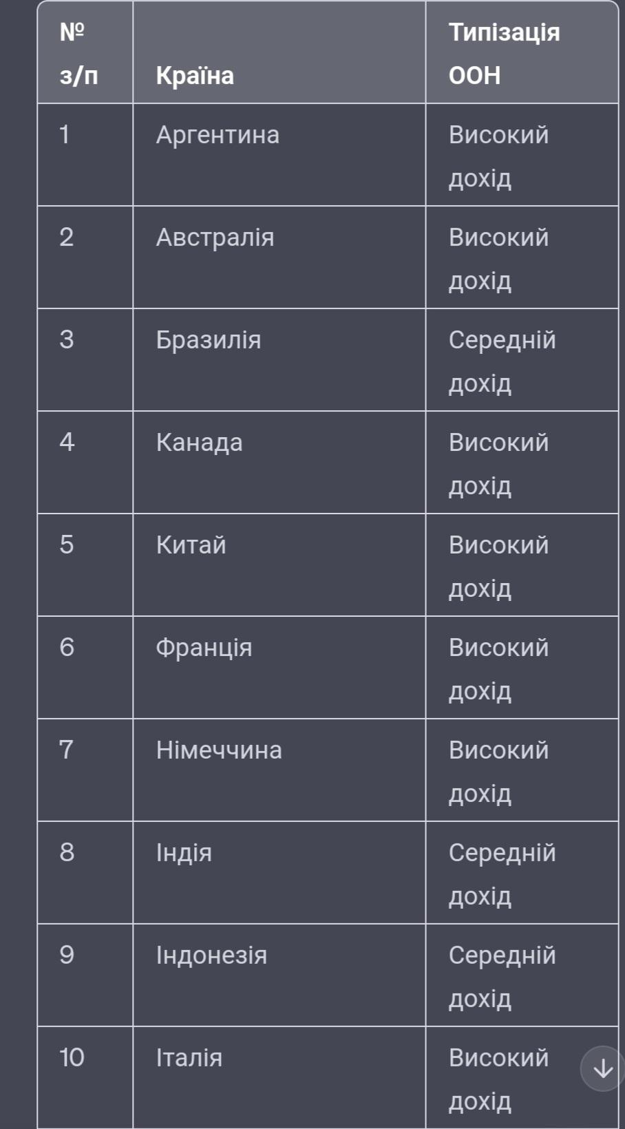 Значну кількість питань з розвитку світової економіки визначають країни «Великої двадцятки». Перерахуйте їх та визначте їх місце в сучасній типізації країн ООН. Опишить їх роль у світовій економіці.