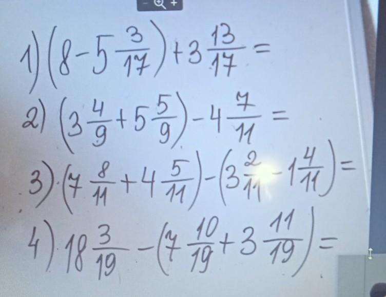 (8 - 5 3/17) + 3 13/17 = Во-первых, нам нужно вычесть 5 3/17 из 8: 8 - 5 3/17 = 7 14/17 Затем мы можем добавить 3 13/17: 7 14/17 + 3 13/17 = 11 11/17 Следовательно, (8 - 5 3/17) + 3 13/17 = 11 11/17. (3 4/9 + 5 5/9) - 4 7/11 = Во-первых, нам нужно добавить 3 4/9 и 5 5/9: 3 4/9 + 5 5/9 = 8 1/3 Затем нам нужно вычесть 4 7/11: 8 1/3 - 4 7/11 = 3 12/33 - 2 15/33 = 1 9/33 = 1 3/11 Следовательно, (3 4/9 + 5 5/9) - 4 7/11 = 1 3/11. 18 3/19 - (4 10/19 + 3 11/19) = Во-первых, нам нужно добавить термины в скобках: 4 10/19 + 3 11/19 = 8 5/19 Затем нам нужно вычесть это из первого члена: 18 3/19 - (4 10/19 + 3 11/19) = 18 3/19 - 8 5/19 Мы можем упростить это, найдя общий знаменатель 19: 18 х 19/19 + 3/19 - 8 х 19/19 - 5/19 = 342/19 + 3/19 - 152/19 - 5/19 Теперь мы можем комбинировать подобные термины: (342 - 152 + 3 - 5)/19 = 188/19 Следовательно, 18 3/19 - (4 10/19 + 3 11/19) = 188/19. (7 8/11 + 4 5/11) - (3 2/11 - 1 4/11) = Во-первых, нам нужно добавить термины в первый набор скобок: 7 8/11 + 4 5/11 = 11 13/11 Затем нам нужно вычесть члены во втором наборе скобок: 3 2/11 - 1 4/11 = 1 10/11 Наконец, мы можем вычесть: 11 13/11 - 1 10/11 = 10 23/11 - 1 10/11 Мы можем упростить это, найдя общий знаменатель 11: 10 х 11/11 + 23/11 - 1 х 11/11 - 10/11 = 110/11 + 23/11 - 11/11 - 10/11 Теперь мы можем комбинировать подобные термины: (110 - 11 + 23 - 10)/11 = 112/11 Следовательно, (7 8/11 + 4 5/11) - (3 2/11 - 1 4/11) = 112/11.